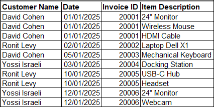 לצורך הדגמה, נשתמש בטבלת מכירות, שמכילה את שם הלקוח, תאריך הרכישה, מספר החשבונית ותיאור הפריט: