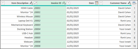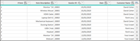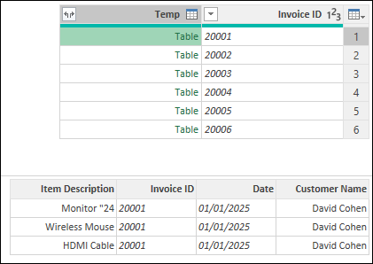 אם נביט בטבלה, נראה של-David Cohen יש שתי חשבוניות שונות – האחת (20001) מכילה 3 פריטים שונים והשנייה (20003) מכילה פריט אחד בלבד.