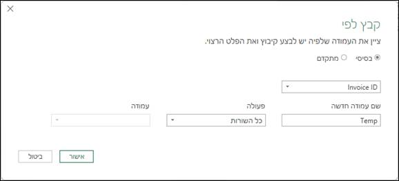 הפעולה הראשונה היא "קבץ לפי" (Group By). יש לקבץ את הטבלה לפי העמודה המזהה (למשל, מספר חשבונית) ולבחור באגרגציה מסוג "כל השורות" (All Rows).