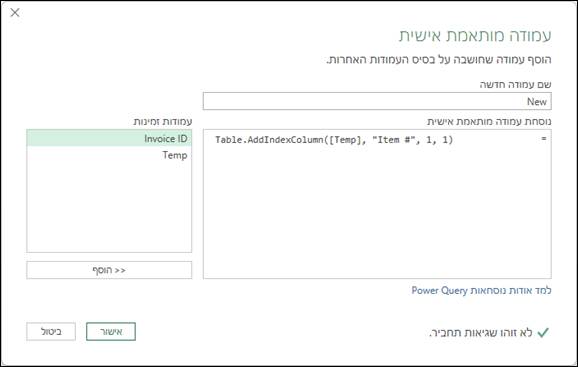 כש Temp הוא השם שנתנו לעמודה שמכילה את החשבוניות המקובצות, ו Item # הוא השם של העמודה החדשה. המספור מתחיל ב-1, וגדל ב-1.