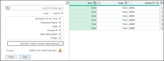 נלחץ על שני החצים הקטנים (Expand) בראש העמודה החדשה שיצרנו (New) ונבחר את העמודות שאותן נרצה להציג (אין צורך לבחור עמודות שכבר מופיעות בטבלה).