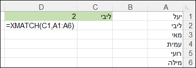 כדי למצוא את המיקום של 'ליבי' ברשימה, נכתוב את השם הרצוי בתא עזר, ונשתמש בנוסחה: