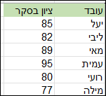 בעמודה B הוספתי את הציון שקיבל כל עובד בסקר שנערך במקום העבודה: