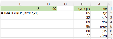 במקרה שלנו – קיבלנו את התוצאה 3, כלומר – הציון 89 שהוא הציון הקרוב ביותר ל-90 מלמטה, נמצא בשורה השלישית בטווח.