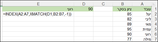 כדי לקבל את שם העובד, יהיה צריך לעטוף את הפונקציה הזו בפונקציה INDEX שמקבלת טווח, ומיקום (שאותו שלפנו באמצעות XMATCH):
